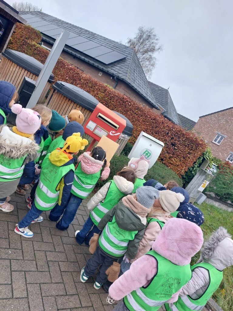 Toen alle kunstwerkjes netjes samengebundeld waren, maakten we ons klaar voor een echte Sinterklaas-wandeling. Met jassen dichtgeritst en mutsen stevig op stapten we vrolijk achter elkaar richting de Spar in Elewijt. Onderweg werd er goed rondgekeken, rustig per 2 gepraat en vooral erg uitgekeken naar het spannendste moment: de zoektocht naar de rode brievenbus!