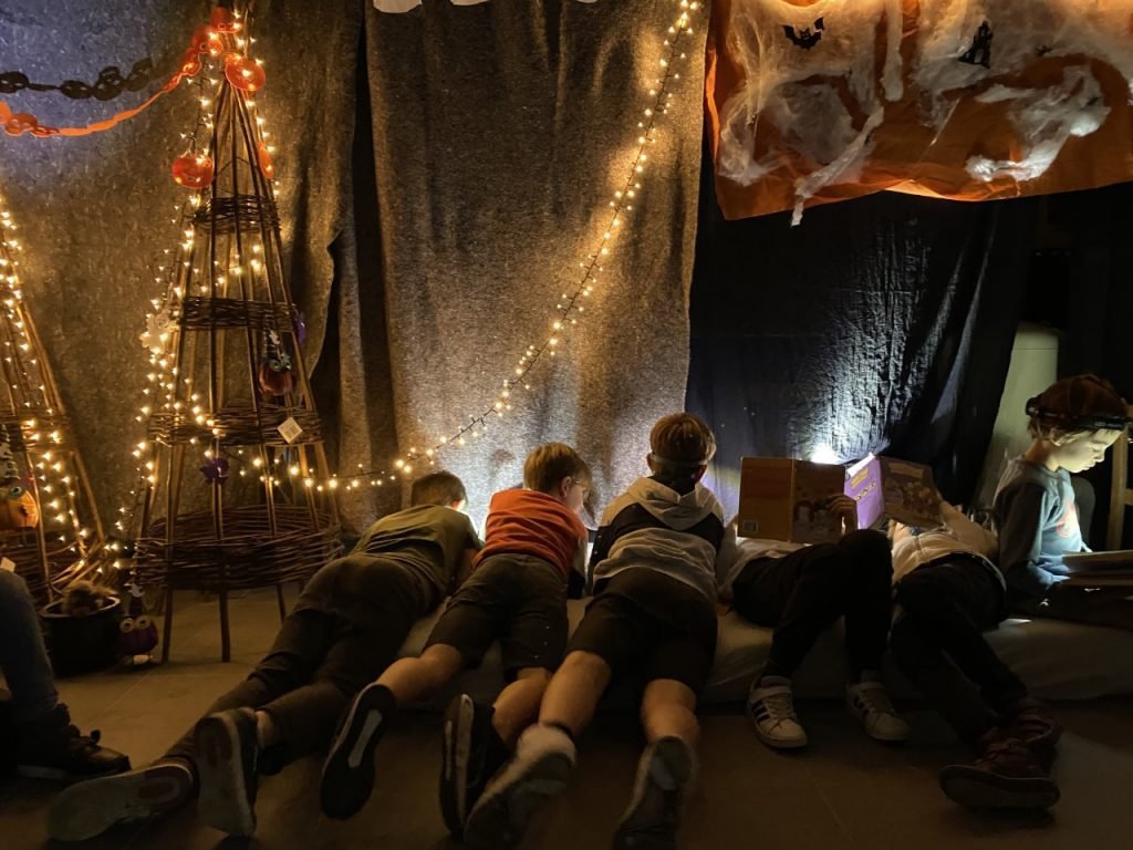 Tijdens de maand oktober maakte de leeswerkgroep twee sfeervolle leeshoeken. Eentje was de herfst-leeshoek in het bosje achter de school en de andere was een Halloween-leeshoek in de kelder van de school. Zoals je ziet op de foto’s was het er supergezellig om te lezen of te luisteren naar een verhaal.